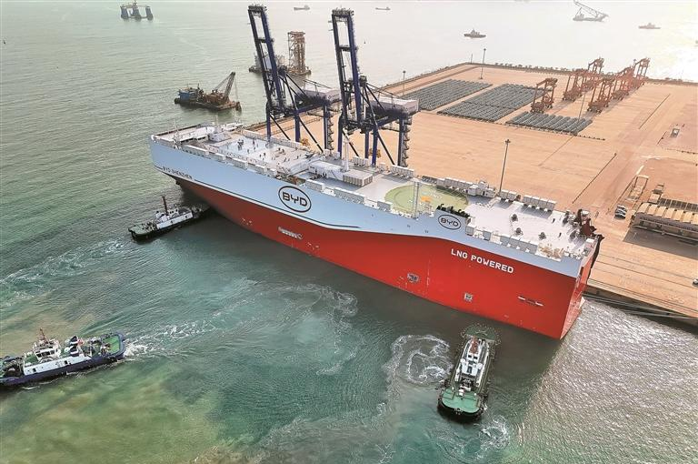 1月22日,,,,,,,银河集团官网集团旗下小漠港区2026年首批“广货”乐成出海——满载6000余辆国产新能源汽车的大型滚装船比亚迪“深圳号”启程驶往欧洲,,,,,,,有力支持广东省人民政府统一安排的“广货行天下”春季行动。。。。。。